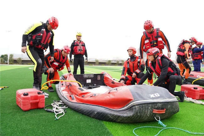 在团队技术方面,把绳索横渡、舟艇横渡和团队涉水等常见场景的6个救援科目作为重点,利用天然河道水域开展训练,固化程序方法。